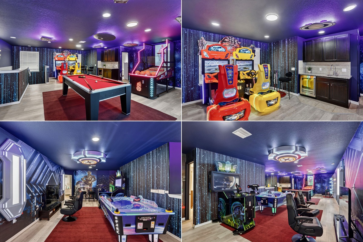 Home Highlights: Beautiful Vacation Home Loaded with Fun - Incredible Star Wars Theme Arcade Game Room - 2 Movie Theaters (one inside the home and one poolside) - 2 Star Wars Themed Bedrooms - Private Southeast Facing Heated Pool/Spa (heating extra $) - Covered Lanai with Bar and TV - 6 King Suites